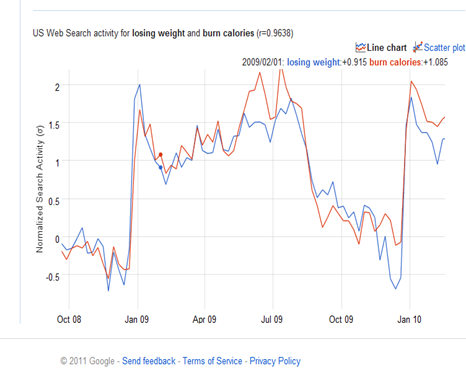 The highest correlation coefficient is with the search “burn calories” and you can see not only the worrying trend of increase in such search trend, but also the seasonality of the search if you zoom into the graph.